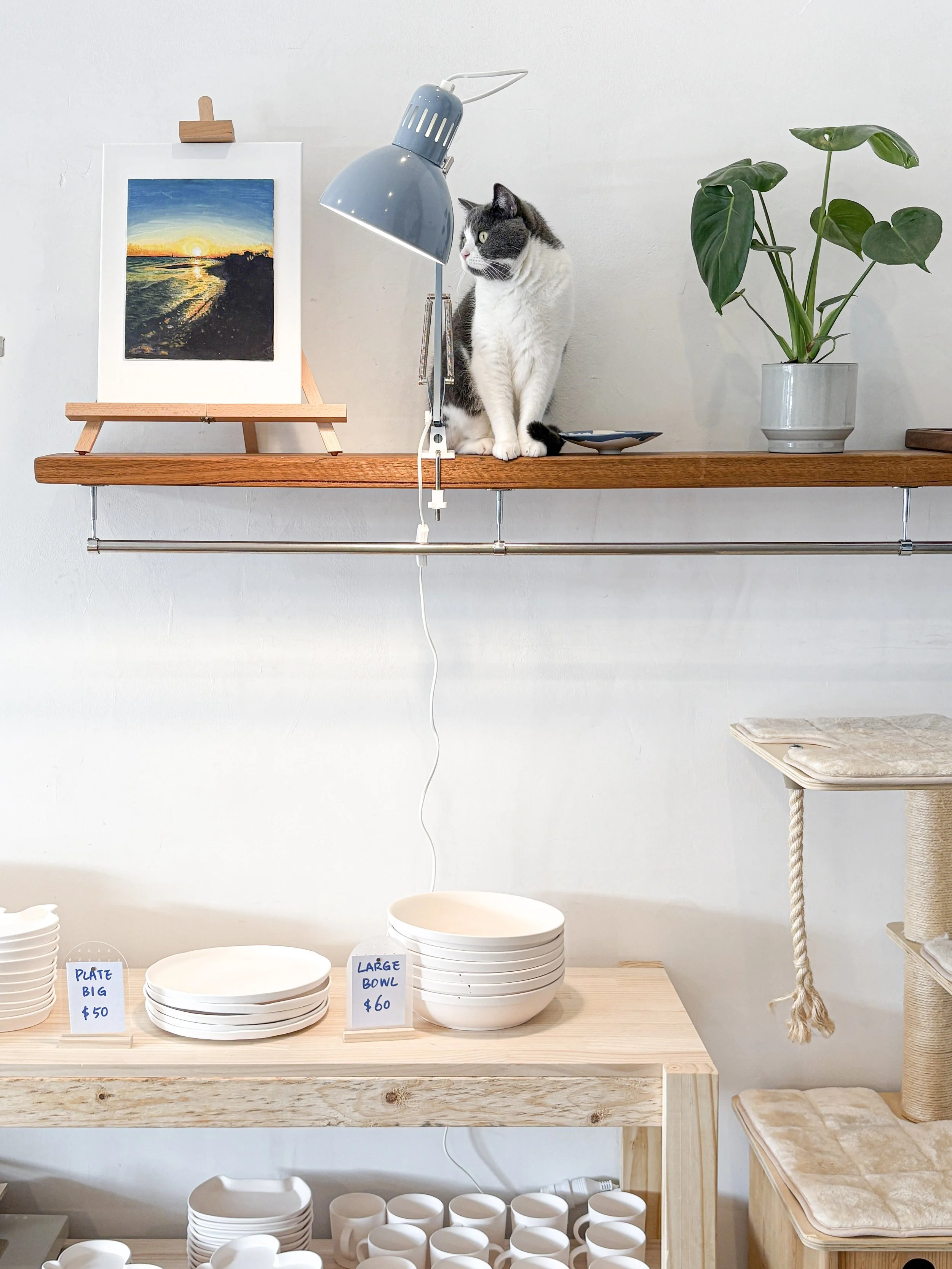 We offer playful, beginner-friendly workshops in wheel throwing, hand-building, and painting pottery, with plenty of room for self-expression (and maybe a visit from our two friendly studio cats).